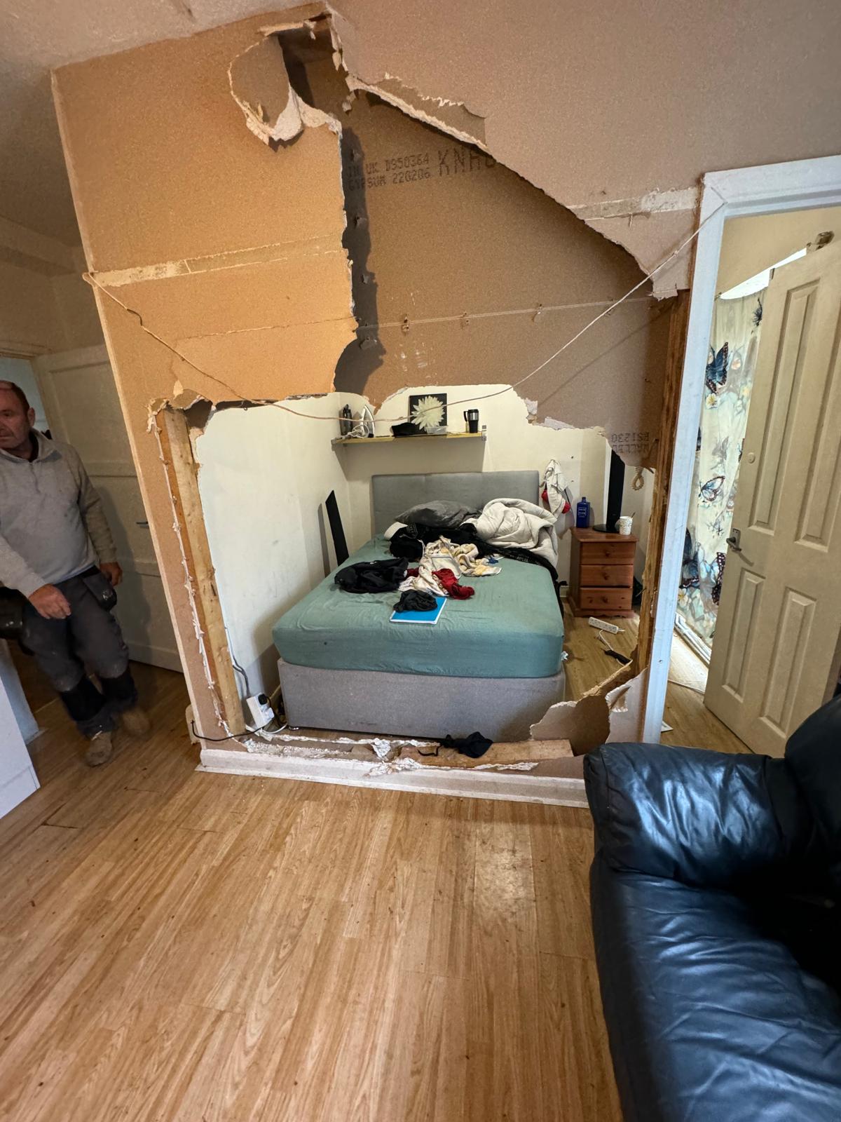 With each step, the true terror unfolded. In the bedroom, a massive hole gaped in the wall, large enough to crawl through offering a clear view straight into the living room. It was as if the tenant had grown weary of doors and decided to create their own path. The edges of the hole were jagged, and crumbled pieces of plaster littered the floor like the remains of a once-happy home.